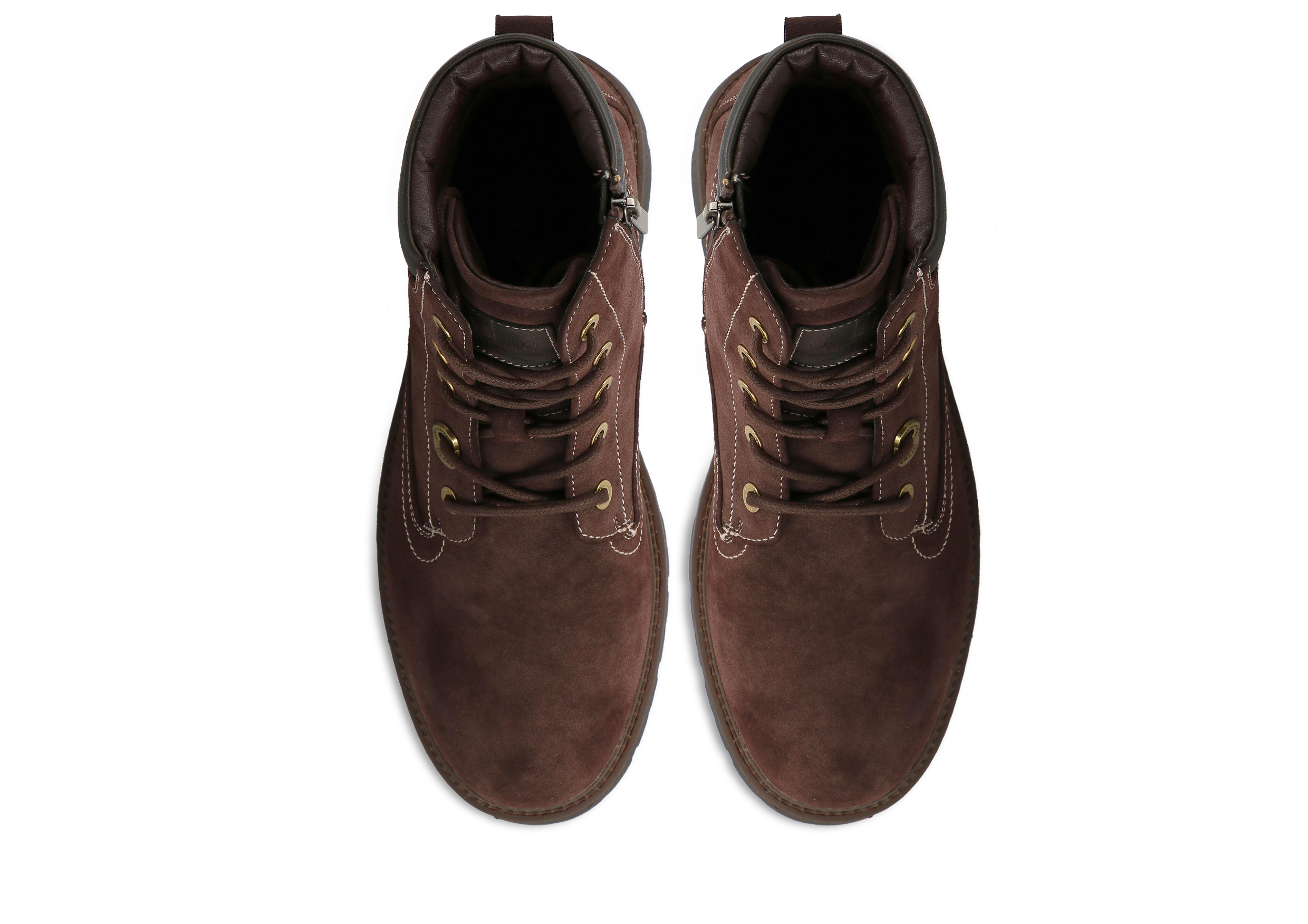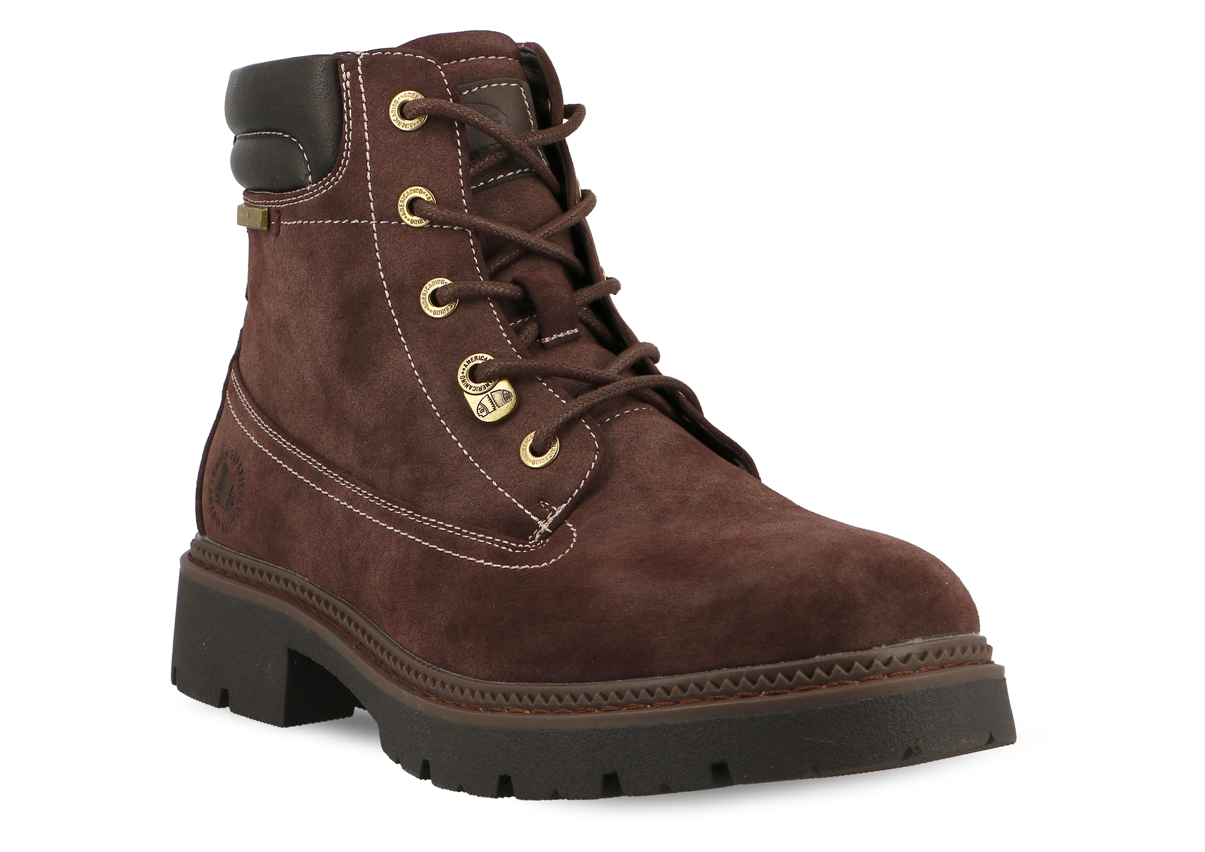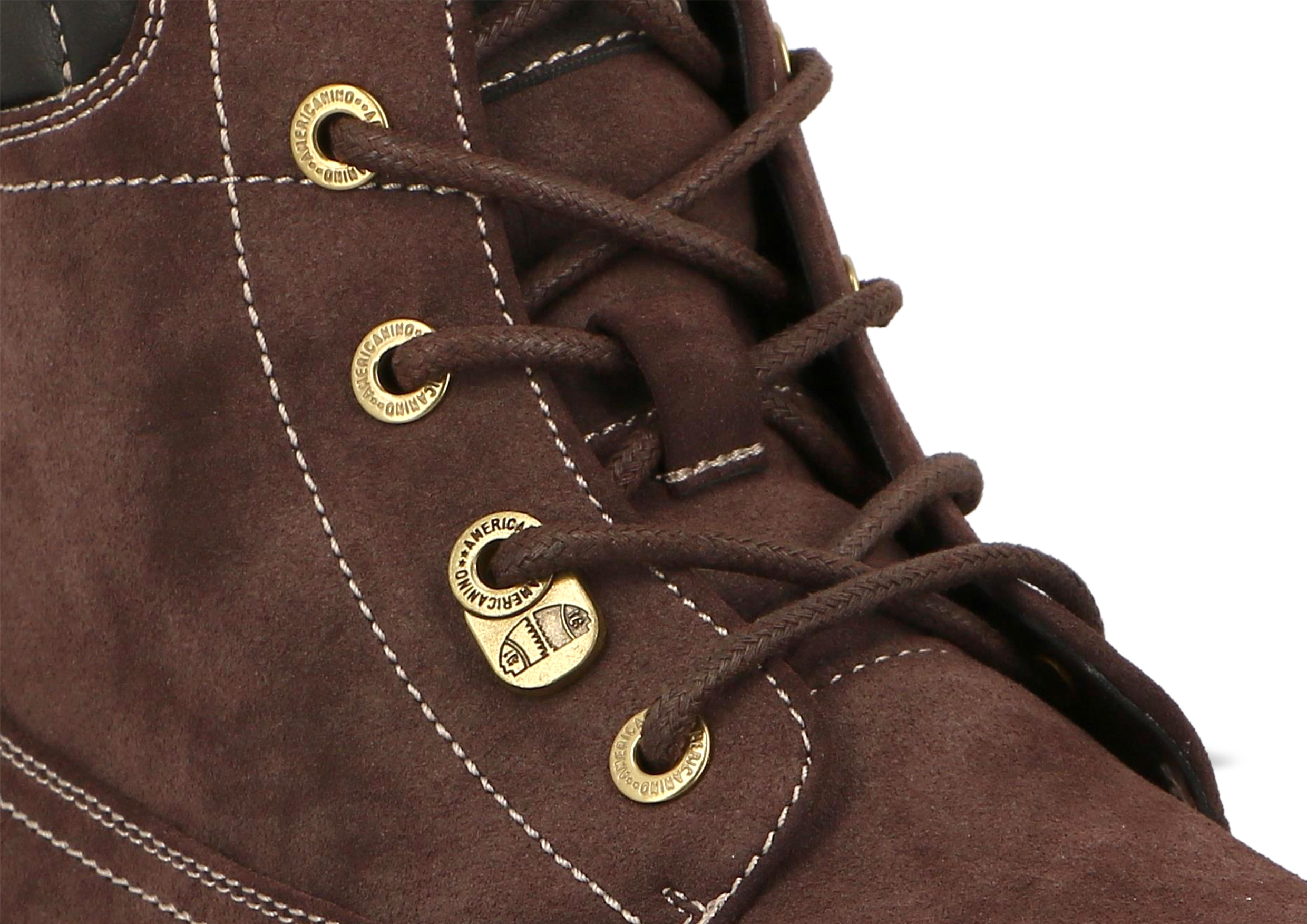 Gli occhielli metallici dorati e i lacci tono su tono esaltano la linea essenziale, mentre il collarino imbottito in ecopelle marrone scuro assicura comfort e sostegno alla caviglia. La suola carrarmato in gomma nera garantisce stabilità, aderenza e resistenza, perfetta per affrontare con grinta sia la città che la natura.