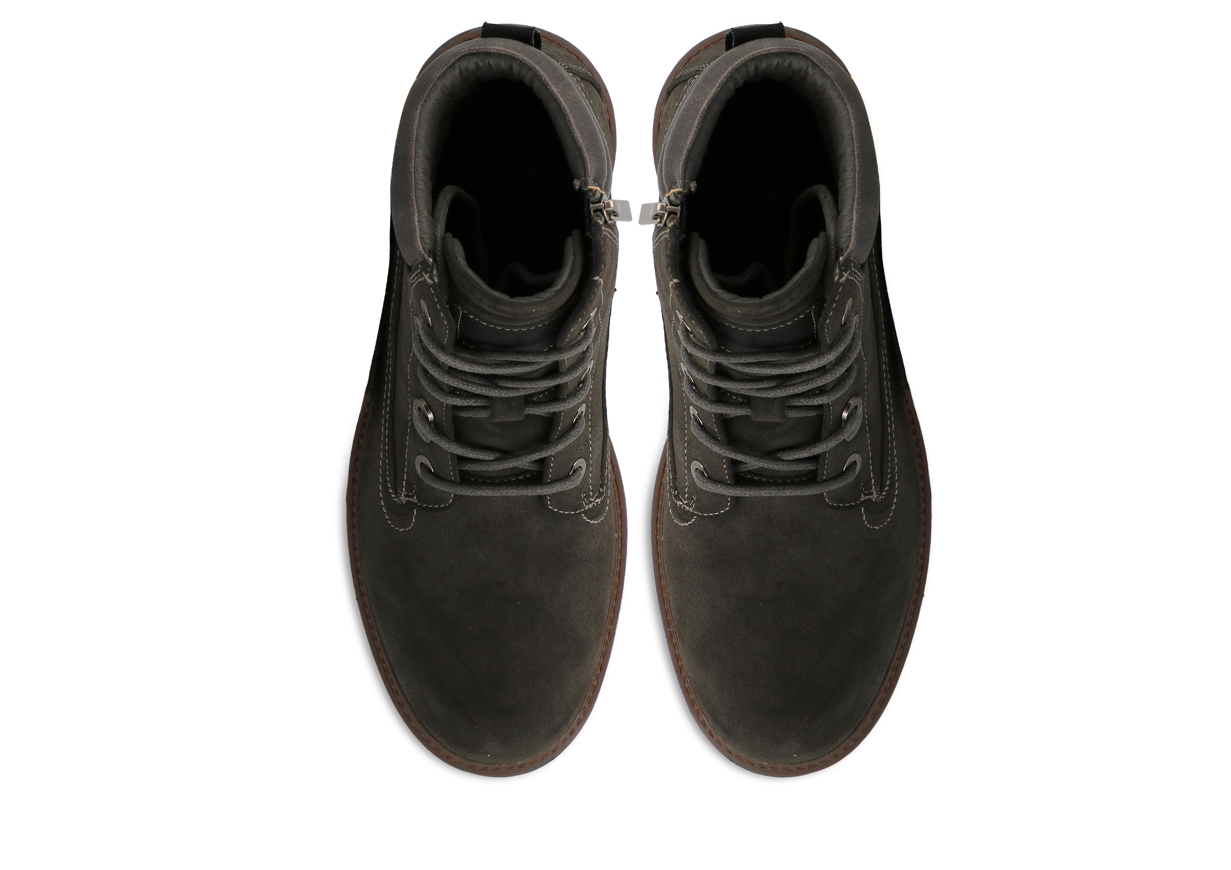 Silver metallic eyelets and tone-on-tone laces enhance its rugged look, while the padded black eco-leather collar ensures ankle comfort and support. The black rubber lug sole guarantees grip, durability, and stability, making it ideal for both city life and outdoor adventures.