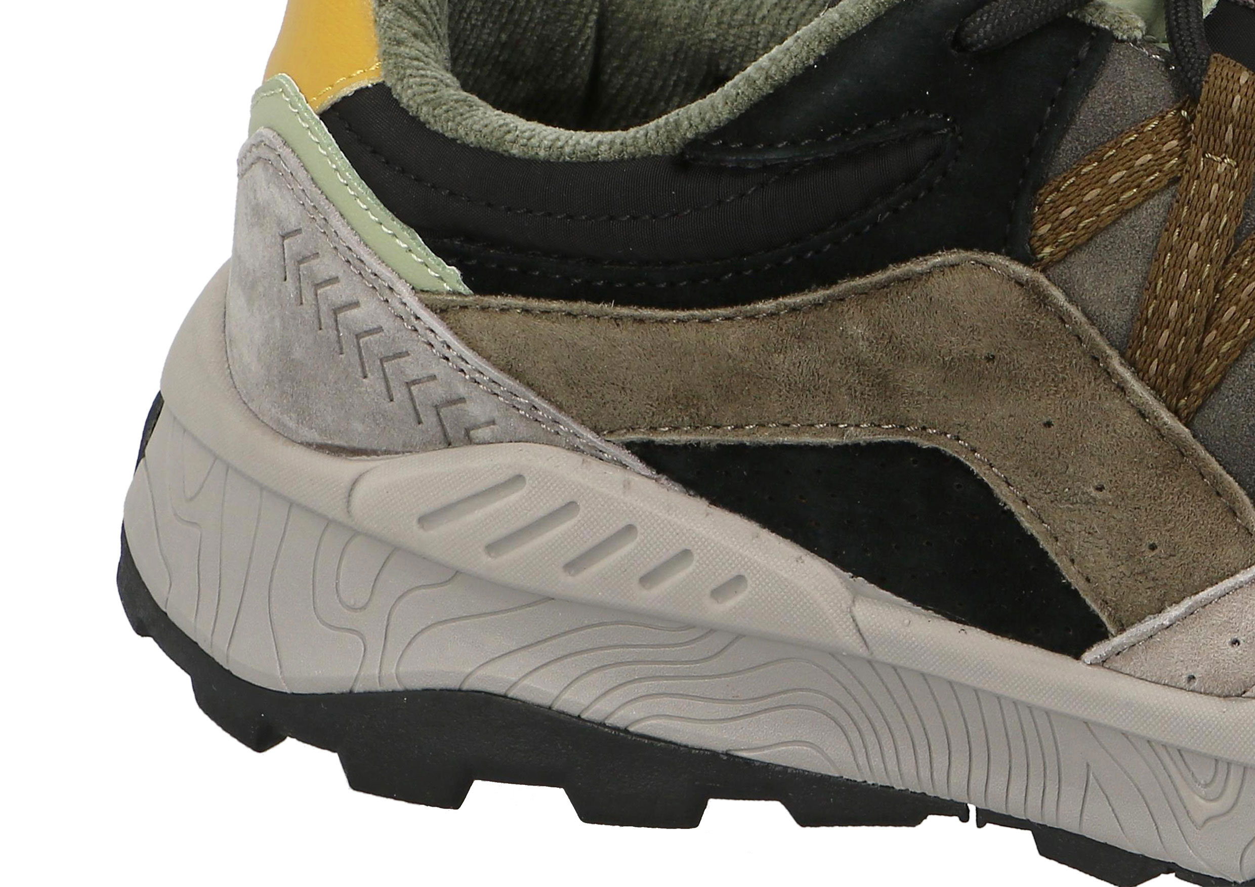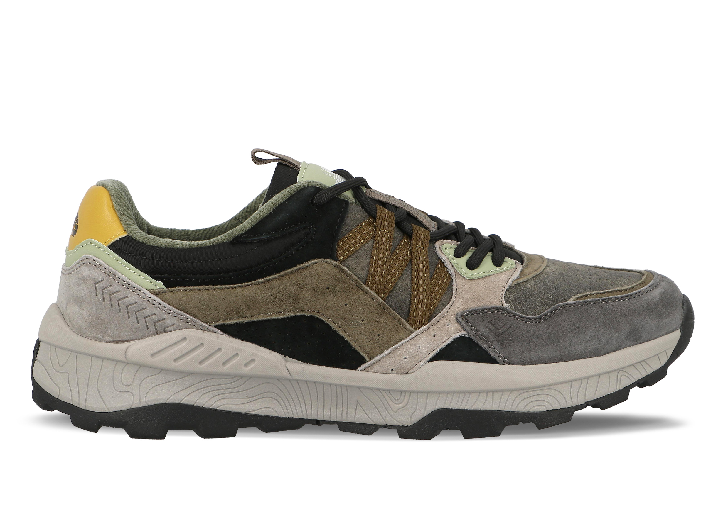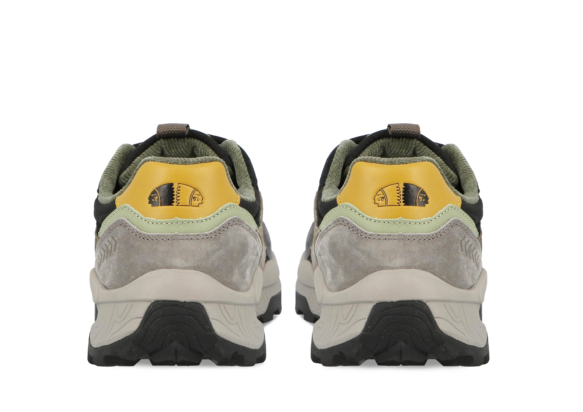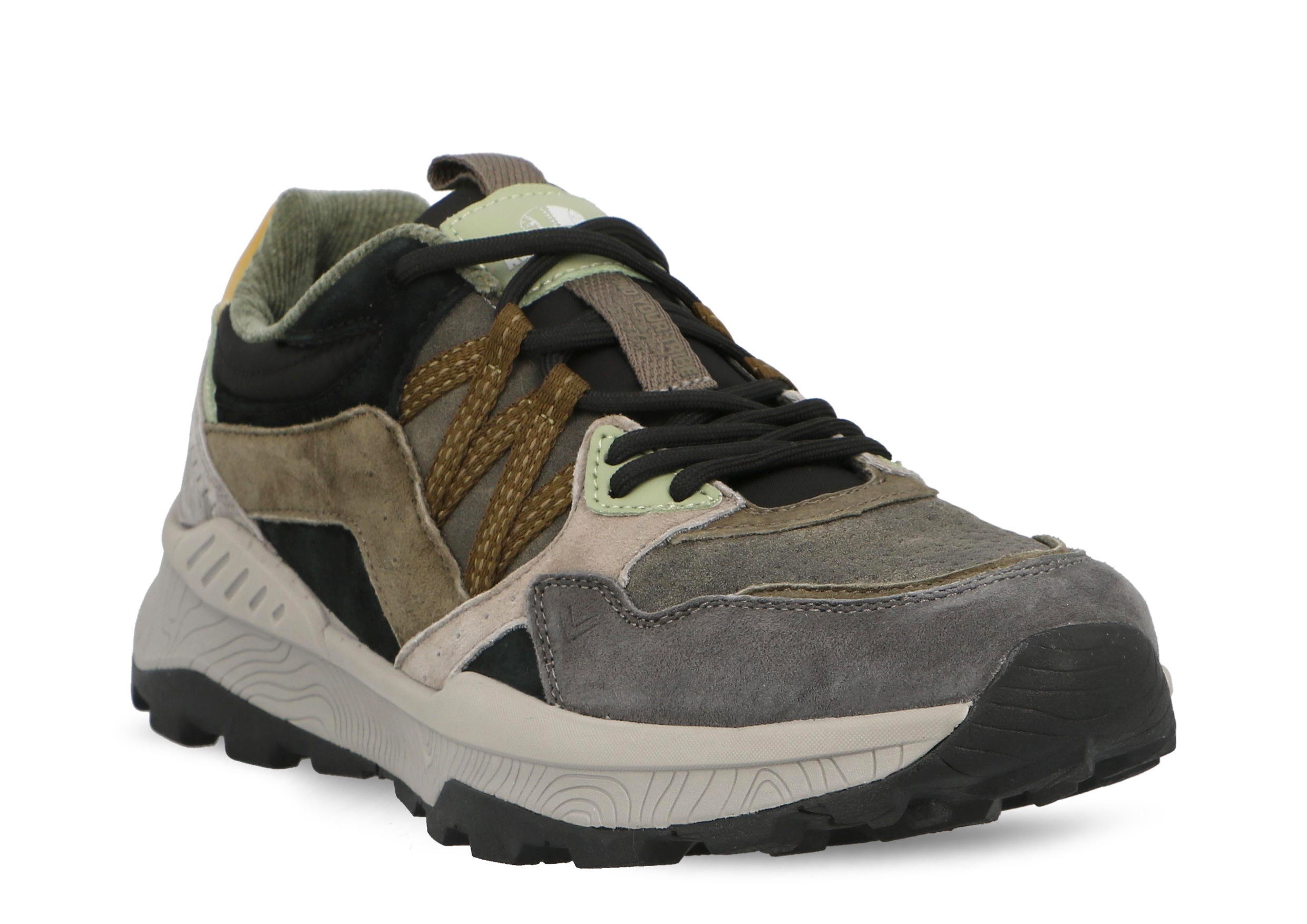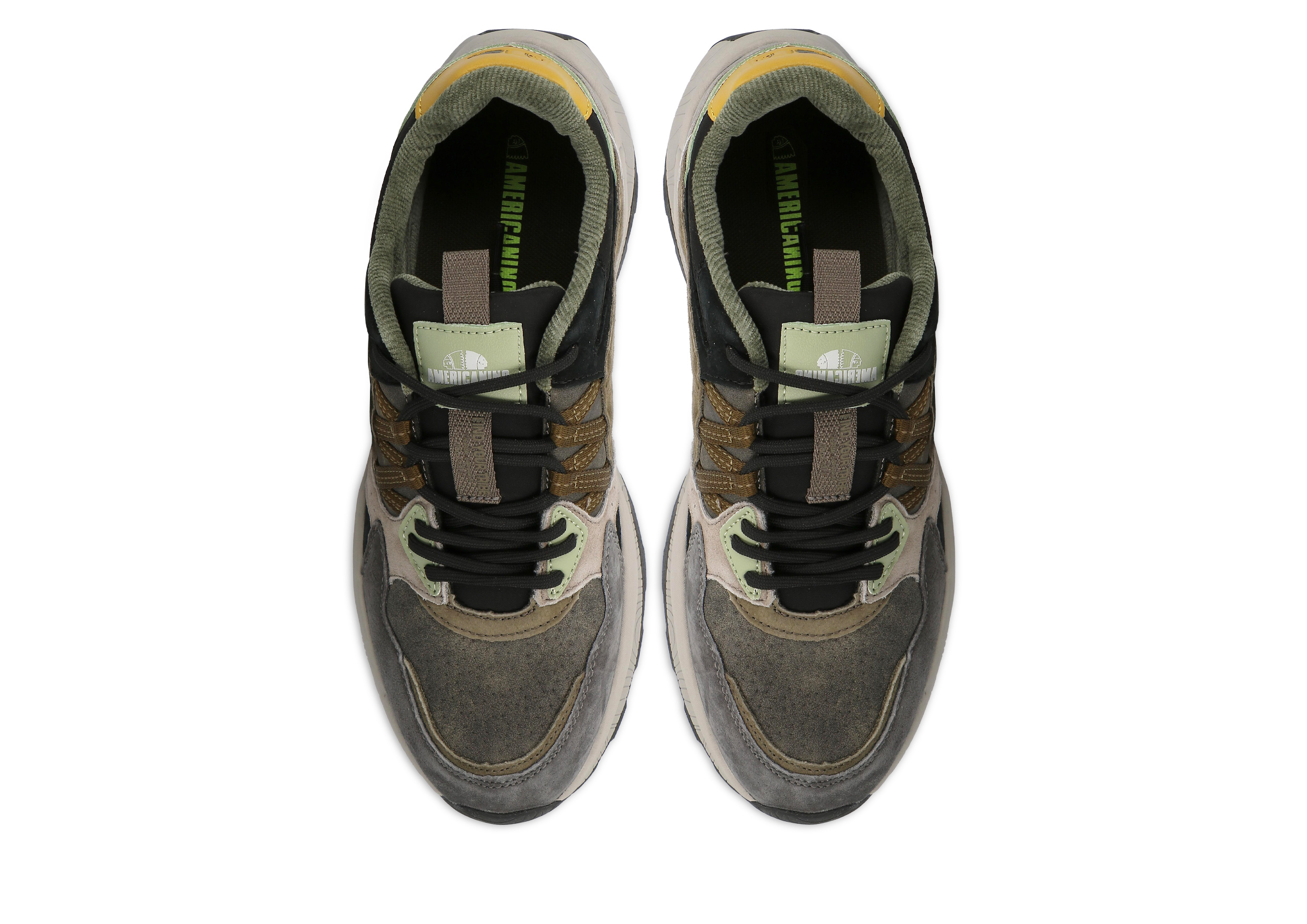 Outdoor inspiration meets urban style in the Americanino KLAY NBK Black, a sneaker with a bold and contemporary design. Made of premium suede and technical fabric, it combines deep black with shades of grey, olive, and mustard accents for a dynamic and authentic look.